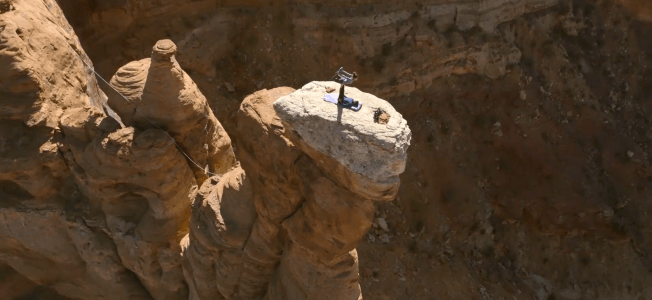 The tight, red canyon walls drop more than 350 feet below leaving you standing at a precipice of possibilities. Everywhere you look you are surrounded by the world’s best of the best in extreme sports, and each one of them is here to collaborate with your inspiration. That is where Scott Rogers and Cody Tuttle, Co-Directors of Wingate Motion, come into play. Documenting such incredible feats was a no-brainer for these two alongside the help of Brian Mosbaugh, Corey McCarthy, and Sarah Taz. Scott and Brian are two of the original Moab Monkeys and have been a part of the festival since it started many years ago. “At the beginning, we were setting world records every year. At the very first GGBY we rigged a 135 foot highline with Terry Acomb called ‘A Walk In The Sun’ and that was a world record. Several years later, Andy Lewis walked a 330 foot line which was the first highline longer than 100 meters,” Scott remarked. While records never have been a priority at the festival, they tend to happen thanks to the creative, open, and energetic people who gather there year after year.