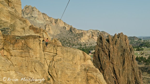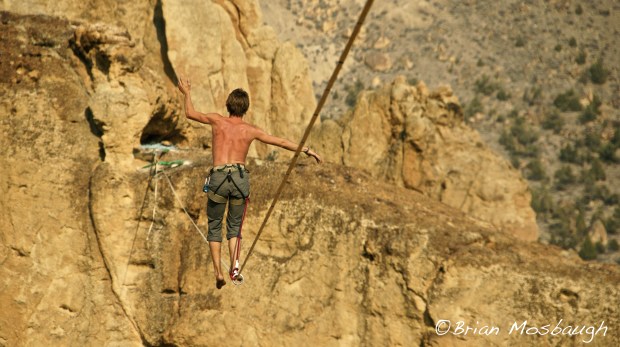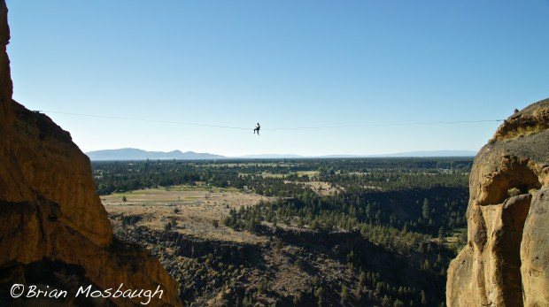 While Smith Rock has numerous options to appease even the pickiest of patrons, I found myself partaking in the heartiest of delicacies, highlining. If you are unfamiliar with the sport, imagine a tight rope walker at a circus; now take away the long pole they use to balance, take the tension out of their rope so that every step results in both lateral and vertical movement, then take the scene out of a circus tent and put it outside in a setting where the wind, daredevil cliff swallows, and 500 feet of nothing below you can play havoc on your mental faculties. Trust me when I say just witnessing the sport can be a heart-pounding experience.