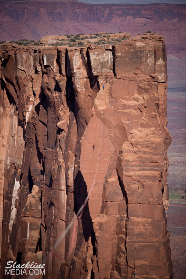 Antony Newton making giant strides across 1,617 feet of a one-inch-wide piece of webbing.
