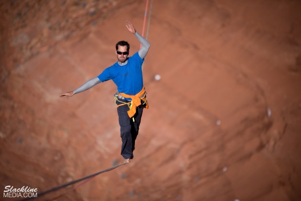 Antony Newton making giant strides across 1,617 feet of a one-inch-wide piece of webbing.