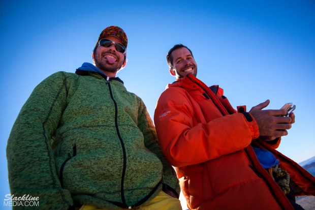Friends Theo Sanson and Antony Newton sharing smiles between walking attempts.