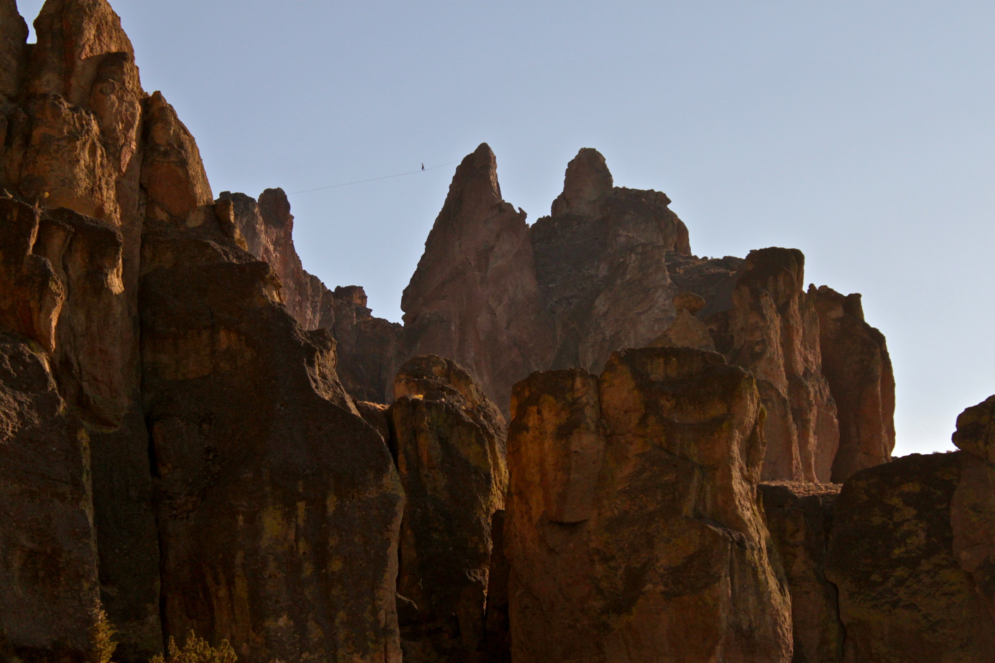 The day seemingly started like all others, nothing drastically different from the rest, aside from the lingering anxiety and excitement from the previous nights sleep. Escaping from my tent into the crisp Fall morning air I realized today was THE day, the highline was finally rigged and awaiting its first crossing… This feeling of mixed emotions, of both elation toward the prospect of success and the stress of confronting a deep challenge, is something I often struggle with when a big line is rigged and the showdown is moments away. “The Kingline” of Smith Rock State Park has, in short, been on my life’s “to do list” ever since I started climbing at Smith 5 years ago. As I saw the obvious rock features towering above the climbing mecca I knew my destiny had been sealed. Ever since that day I had envisioned the two points in space connected with an imaginary line with every passing day I entered the park, it was quite literally staring me down and haunting my dreams. Rising up 500′ above the Crooked River, which snakes its way around the sculpted volcanic rock of Smith, the gap appeared to initially be about 200′ apart but was later discovered to be around 180′ instead. This distance was certainly going to be a revealing test of my balance, mind and willpower to stay centered and on the line throughout. Would I stand the pressure or fall from fear of success or failure? The day had not fully started and I knew the answers weren’t far away…