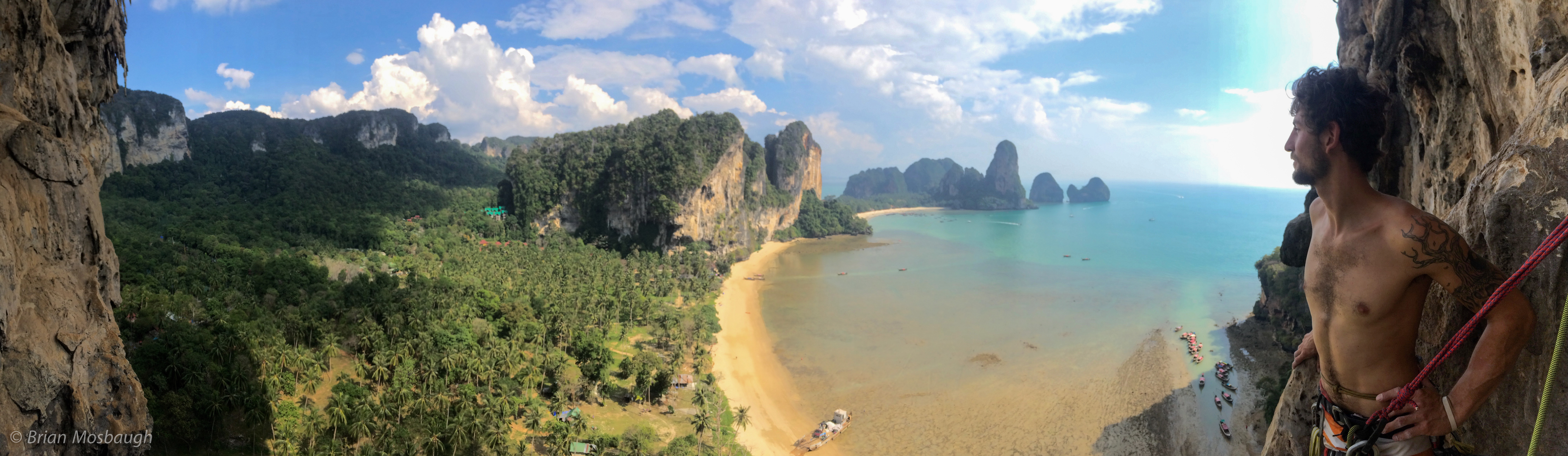 Wade Plafcan and I taking in the beautiful panoramic view of Tonsai while climbing Heart of Darkness in Thailand.