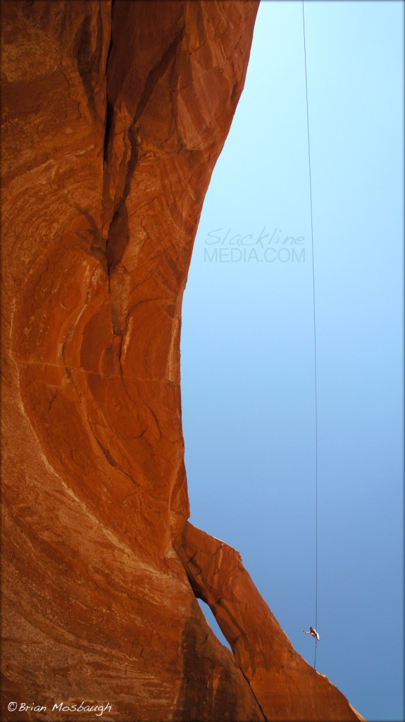 Scott Rogers prepares the mind for the mental battle of walking the 160′ of Arch Nemesis, Moab’s newest highline addition to the ever growing outdoor playground arena.