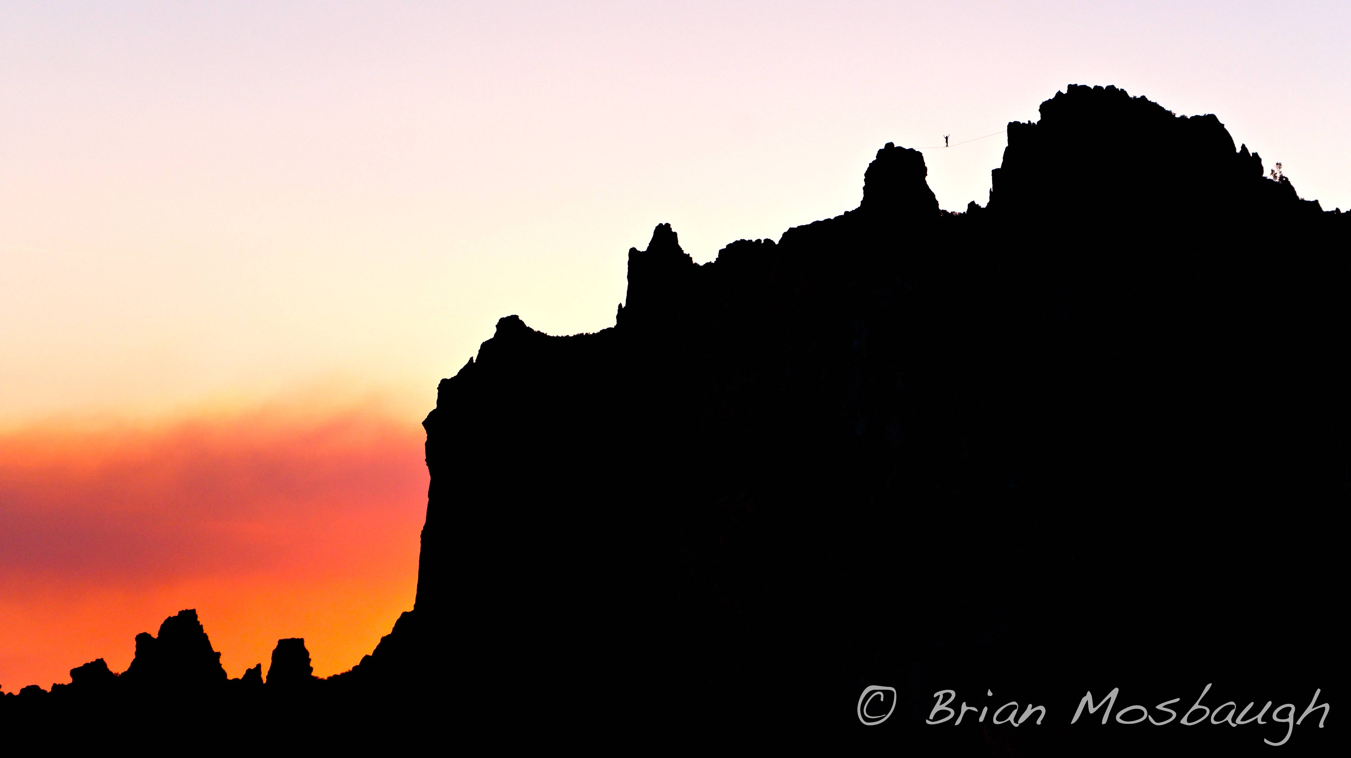 Alex Stewart feeling the focus of walking his first highline, “The Gift” at Smith Rock, as wildfire smoke creates unusual sunset colors