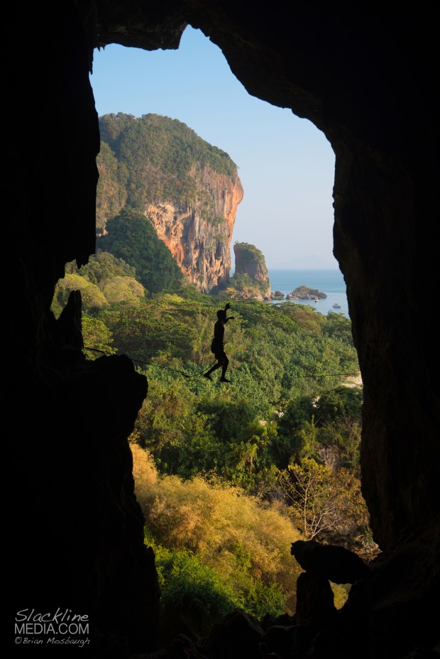 One of the great joys I find in highlining is the exploration for new space all over the wold. On a recent expedition to Thailand I was able to rig many new slacklines, including this cave highline around the infamous climbing area of Tonsai. Rigging in the dark and utilizing all natural anchors, I handed my girlfriend my camera, framed up a shot and had her document this image as I passed by the portal exit. Thanks Aleta Edinger for hitting the shutter button and enduring the hot conditions.
